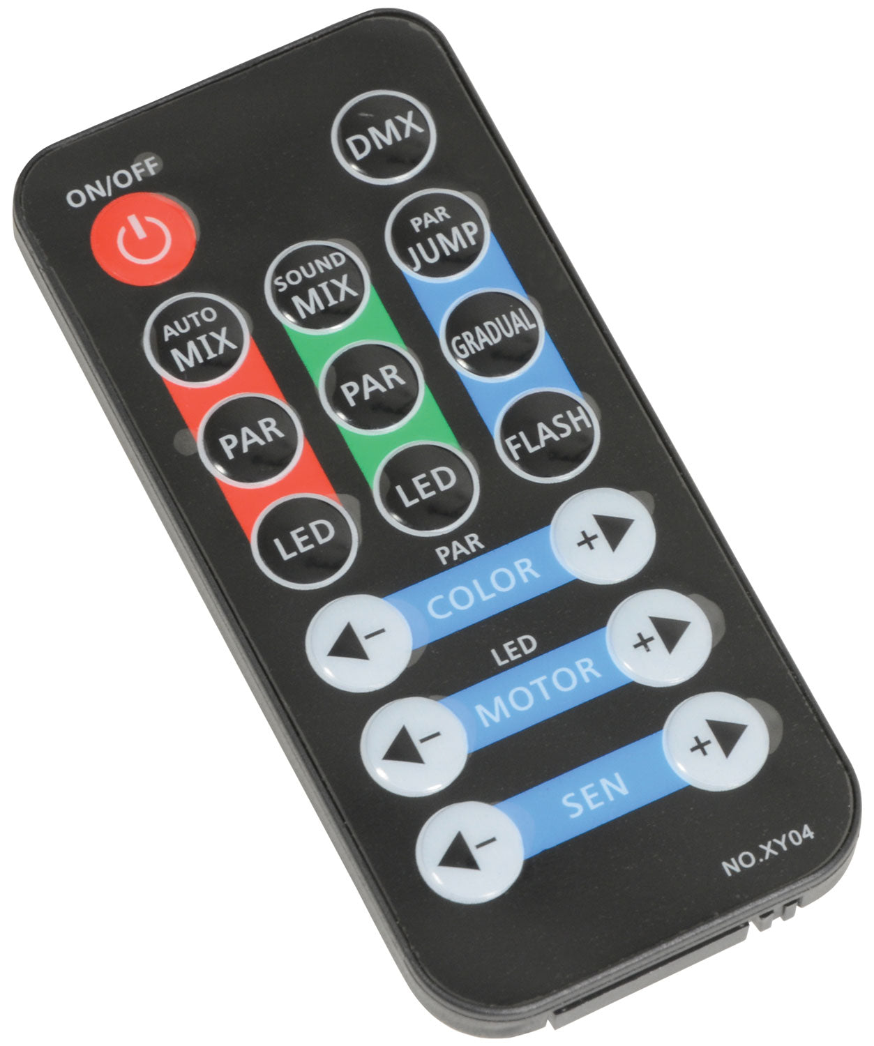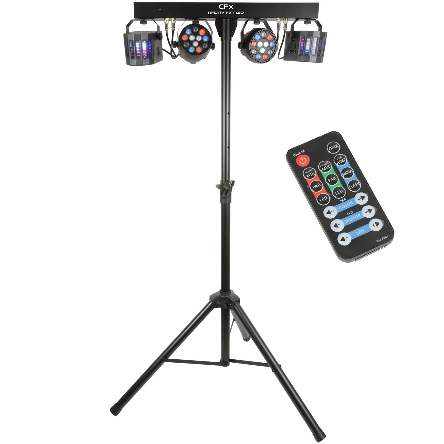 Portable lighting set with 2 PAR cans and 2 LED Derby effects powered from a main T-bar. Controlled via DMX, infrared remote control or internal auto and sound-activated programs selectable from a control panel. Each lighting fixture is angle-adjustable to distribute colour washes and effects around the room. Designed as a complete light effects solution for parties, performers and special events