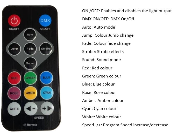 Modes : Static colour, colour change, colour fade, auto, sound active, DMX, master/slave